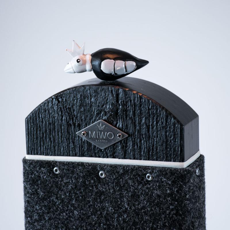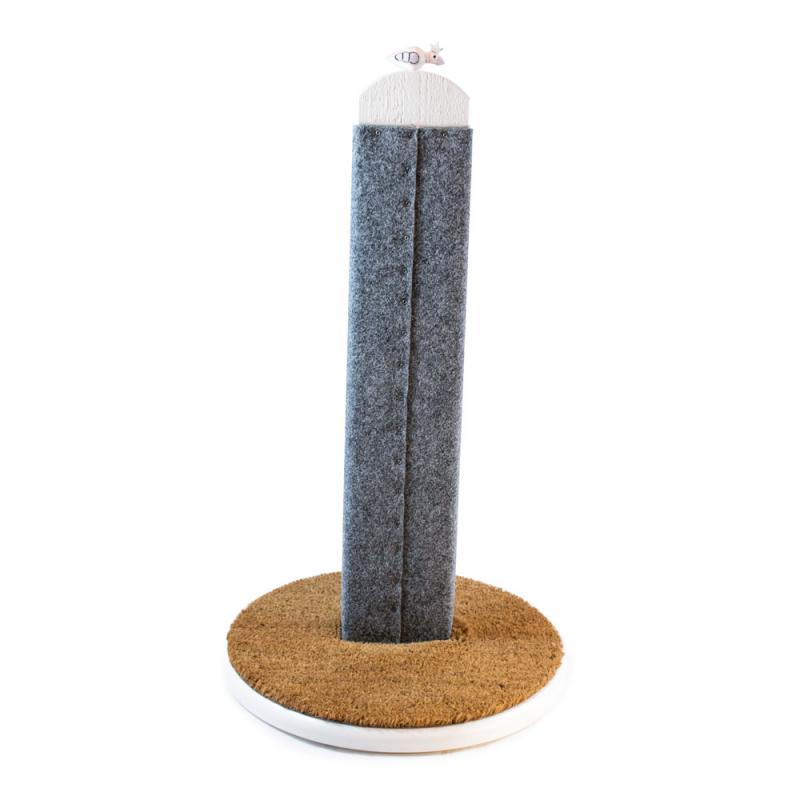 Torpa klöspelare klädd i nålfiltsmatta i skandinavisk design för den stilmedvetne kattägaren. Klösträdet har en rund bottenplatta i lackad MDF med kokosmatta som katterna också älskar att klösa på. Mattorna är lätta att att byta om de skulle bli slitna. På toppen sitter vår fågel Birdie i svart och håller ett vakande öga.